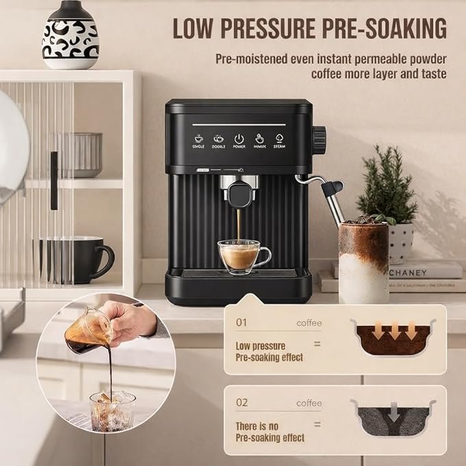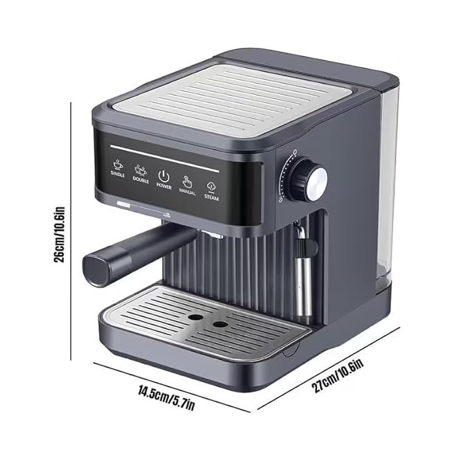 Enjoy barista-quality coffee at home with this modern espresso coffee machine. Designed for coffee lovers, it features an easy control panel with single and double shot options. The built-in steam wand allows you to create creamy milk foam for cappuccinos and lattes.