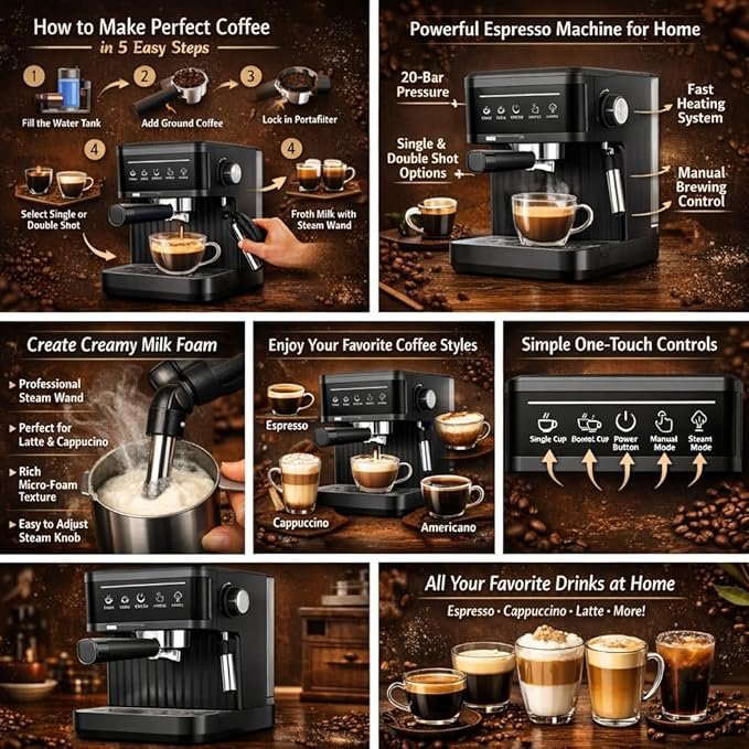 Make café-style coffee at home with this powerful espresso coffee machine. It supports single and double shots, built-in steam wand for milk frothing, and easy manual controls to prepare espresso, cappuccino, latte, and iced coffee.