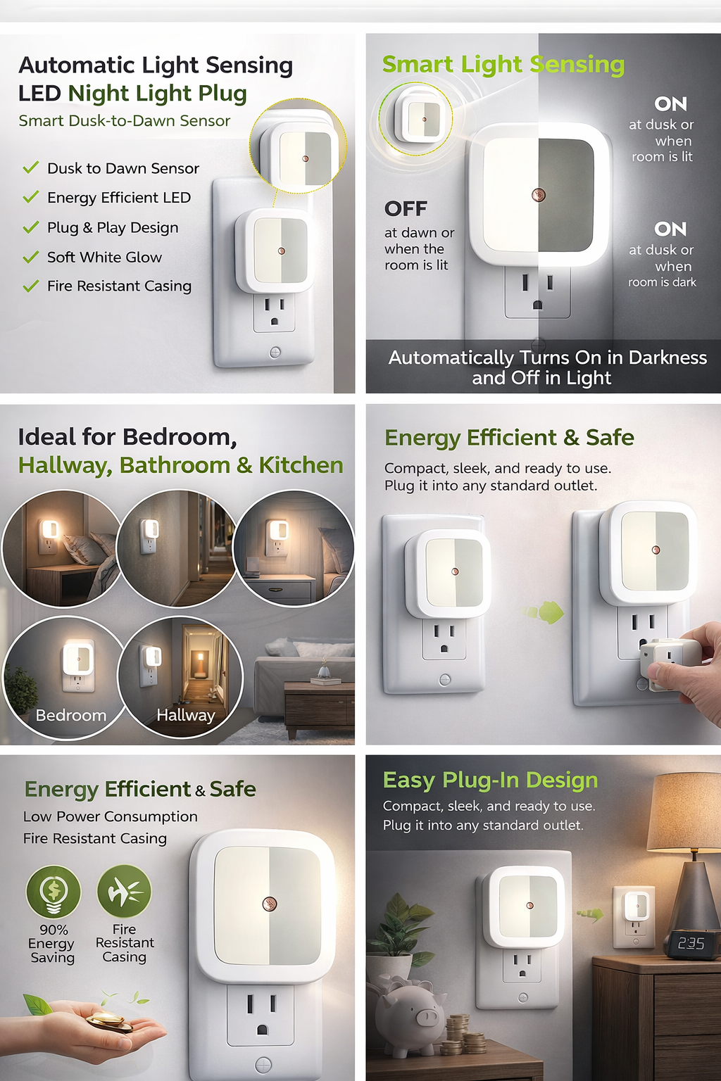 Automatic light sensing LED night light jo andhera hone par automatically ON ho jata hai aur room me light hone par OFF ho jata hai. Bedroom, hallway aur bathroom ke liye perfect.